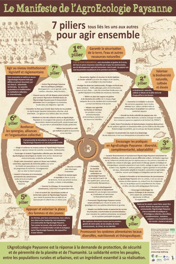 Le 22, 23 et 24 avril 2017, sous l’égide de la CNOP avec l’AOPP/ Programme PAIES/IRPAD, COFERSA, COASP-Mali, GRDR, AMASSA AFRIQUE VERTE, La Convergence globale des luttes de la terre et de l’eau et de nombreux autres acteurs nationaux et régionaux y compris 4 représentants ministériels (Agriculture, Élevage et Pêche, Recherche et Environnement), a été validé Le Manifeste de l’Agroécologie paysanne de Nyéléni (Centre International de Formation en Agroecologie Paysanne Nyéléni de Selingué, Mali), articulé autour de 7 piliers. (sources : La Via Campesina 2017, Hambe 2024)
